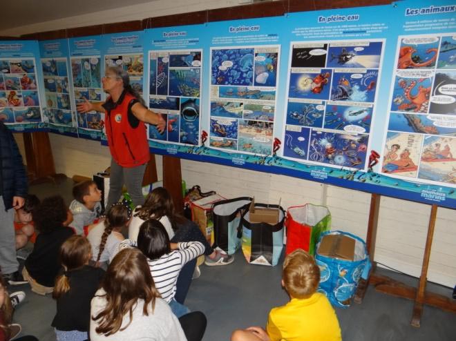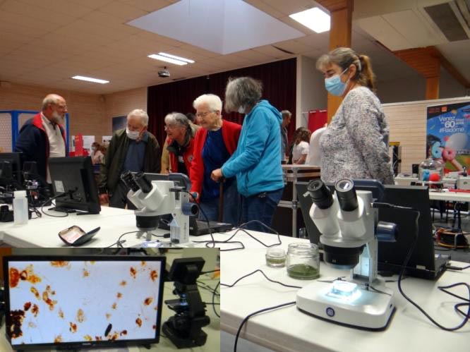 En plus des ateliers (production d’hydrogène par électrolyse, maquette d’une voiture électrique alimentée par une pile à combustible à l’hydrogène, optique de l’œil et corrections par des lunettes, couplage électromagnétique, électricité statique, transmission d’énergie entre balles de tailles différentes, course sur plan incliné de boites de conserve lestées afin d’illustrer l’influence du positionnement des masses, observations microscopiques du plancton …), nous avons présenté deux expositions : « Les animaux ont la parole » et « Les animaux marins en bandes dessinées » qui ont eu beaucoup de succès auprès des jeunes visiteurs, notamment quand elles ont pu être commentées. Le jeu de plateau géant « Mareco » a pu inciter les joueurs à se préoccuper des problèmes de protection des récifs coralliens.