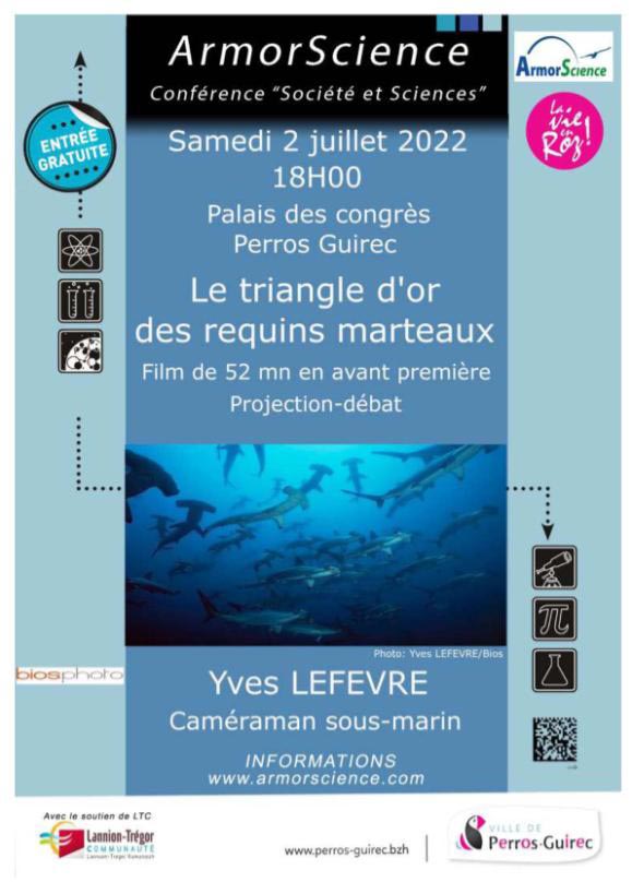 Nous vous rappelons la tenue de notre prochaine conférence, qui sera donnée le samedi 2 juillet à 18:00 au Palais des Congrès de Perros Guirec. Intitulée « Le triangle d’or des requins marteaux dans les mers de Colombie », elle consistera en la projection en avant première d’un film de 52 minutes suivie d’un débat et d’échanges avec Yves Lefèvre, caméraman sous-marin.
